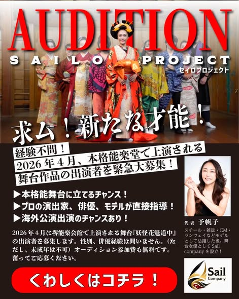 求ム!新たな才能! 経験不問!2026年4月、本格能楽堂で上演される舞台作品の出演者を緊急大募集! ▶本格能舞台に立てるチャンス! ▶プロの演出家、俳優、モデルが直接指導! ▶海外公演出演のチャンスあり! […]